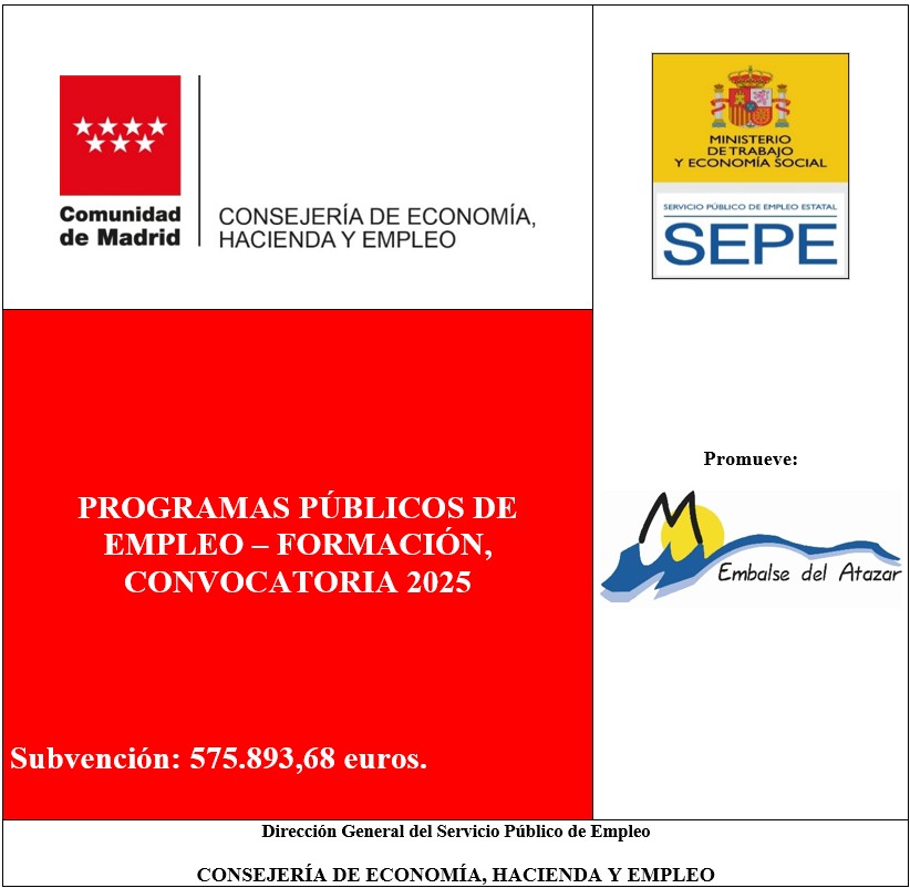 La Mancomunidad Embalse del Atazar ha sido beneficiaria de las ayudas para el año 2025 del Programas públicos de empleo-formación de la Consejería de Economía, Hacienda y Empleo de la Comunidad de Madrid, con una dotación de un total de 575.893,68 € financiados con cargo a los fondos recibidos del Servicio Público de Empleo Estatal, …